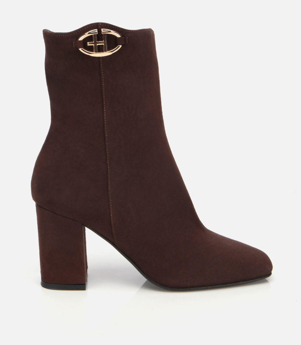 Kadın Süet Deri Kahverengi Tokalı Kare Uçlu Bilekte Topuklu Bot
