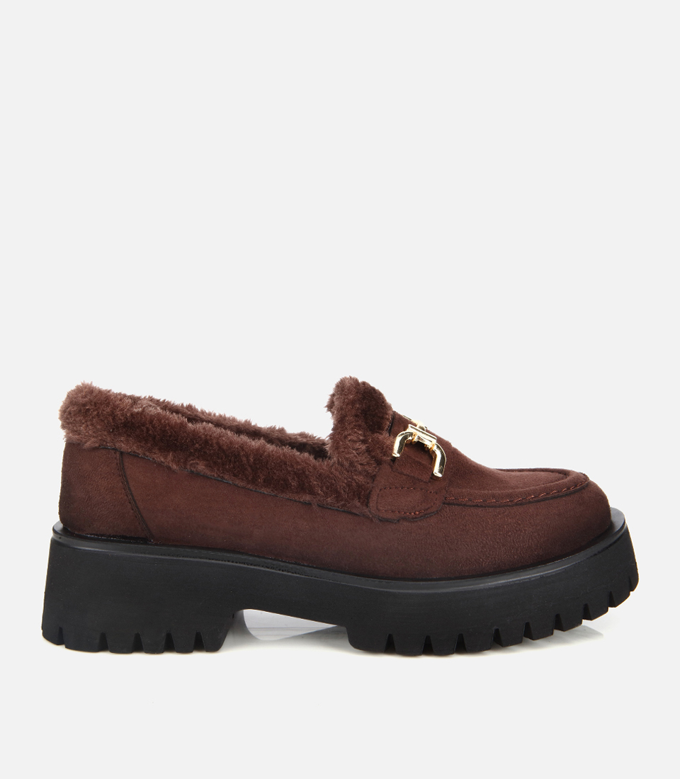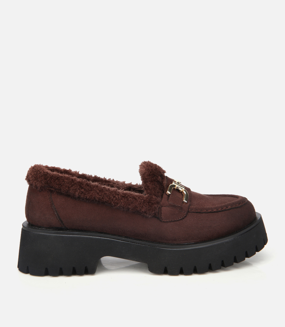Kadın Süet Kahverengi Kürklü Tokalı Kalın Tabanlı Günlük Loafer