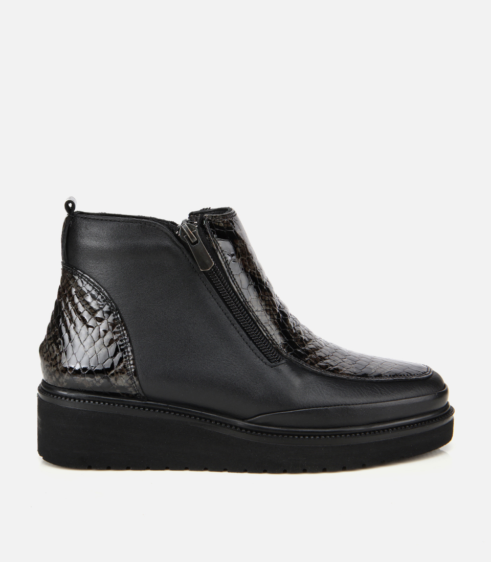 Kadın Deri Siyah Dolgu Topuklu Deri Baskılı Topuklu Bot