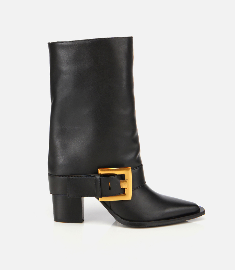 Kadın Deri Siyah Pantolon Görünümlü Gold Tokalı Kalın Topuklu Bot
