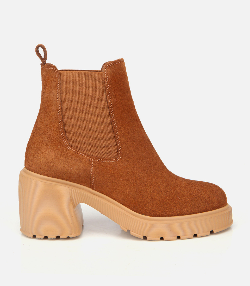 Kadın Süet Deri Taba Lastik Detaylı Topuklu Bot